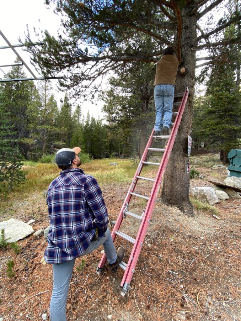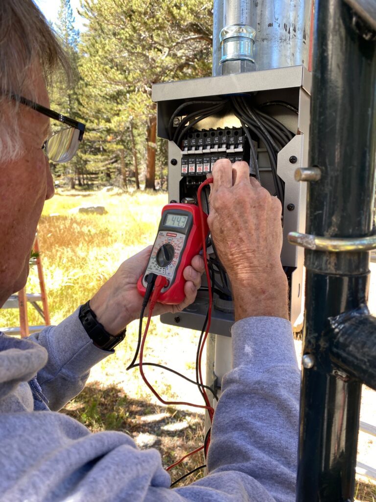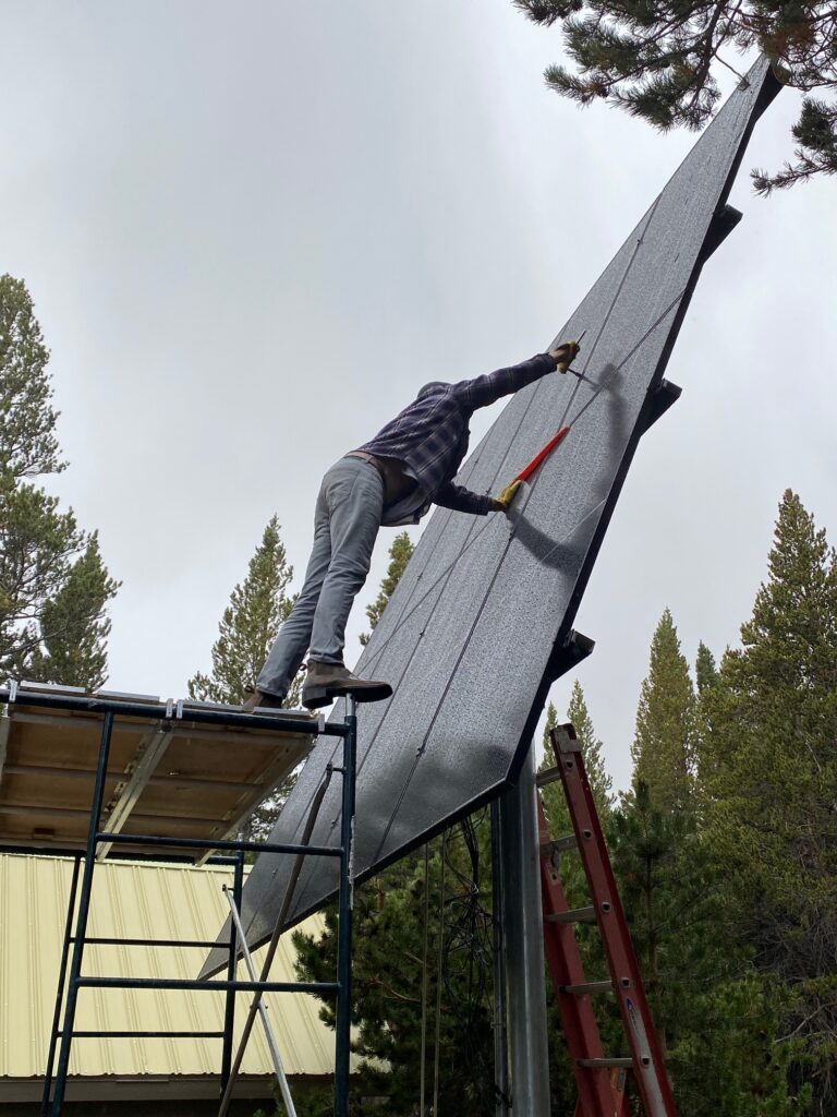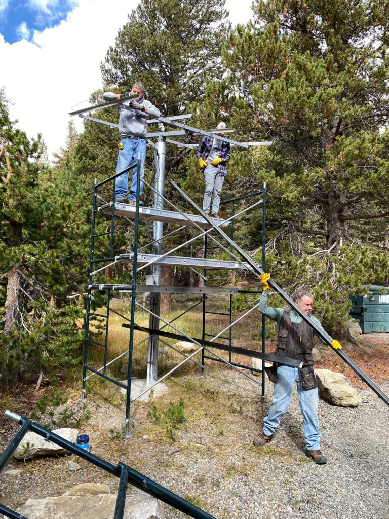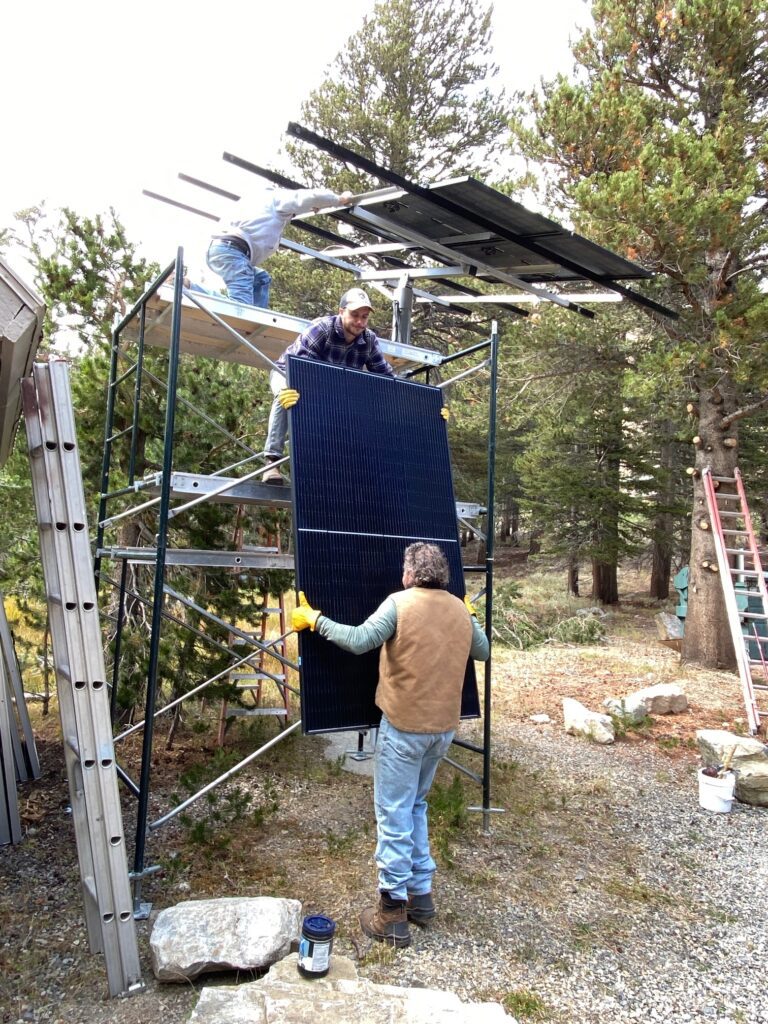 Over the weekend of September 13th, a significant solar upgrade was completed at the Virginia Lakes solar pump house. Thanks to the hard work of Ross Oswald, Mark Shaff, and Lucas Shaff, solar panels were removed and replaced with new, higher-capacity panels. The crew erected scaffolding, expanded the existing panel racking, and completed the installation under cool fall skies, with a light rain passing through.